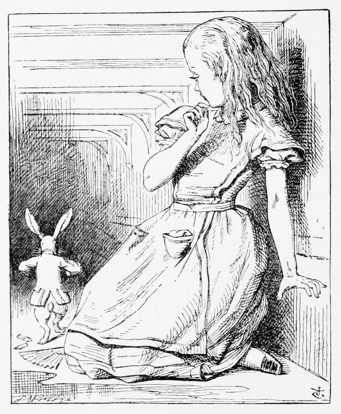 しばらくして聞こえてくる遠くのぱたぱたという足音、あわててなみだをぬぐって近づくものに目をやると、そう、あの白ウサギがまた帰ってきたんだ、おめかしして、白ヤギの手ぶくろを片手に、大きなせんすをもう片手に持っていてね。大わらわでどたばたやってきて、ぶつぶつ言いながらこっちへ来るんだ。「およよ!