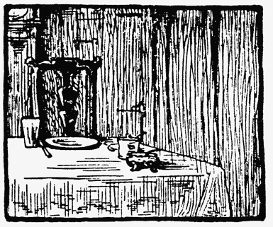 そのおくのほう、 テーブルの はしにだけ テーブルクロスが 広げてあって、 そこに 取りざらと タンブラー、 ナイフと フォーク、 しお入れに からしと イスが あり ―― つまるところ だれかさんの 夕ごはんの したくなのでした。