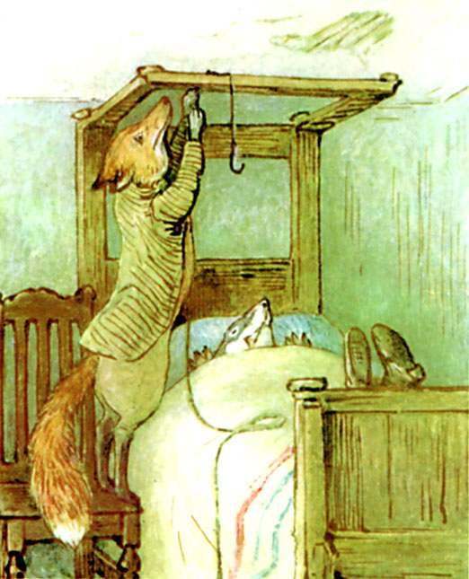 なにやら きょどうふしんな きつねめさん (なにぶん まどと ドアに はさまれたところに ベッドが あったので)。 ちょこっとだけ まどを あけて そこから ものほし用 ロープの 大半を 外へ おしだします。 手元に のこったのは ロープの はしっこ、 フックが ついていました。 ねんいりに いびきを かく あなぐまトミー。
