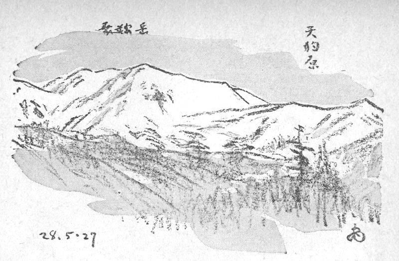 これが爺ガ岳のについで、二番目に知られた種蒔爺で、昭和十六年五月、私が御岳黒沢口の三合半、日ノ出滝に滞在して画作に従事していた時、たまたま私の写生画が縁になって、土地の人から教えられたものだ。当時私は意外な獲物に、大いに驚きかつ喜んで、帰来日本山岳会々報に紹介の筆をとったものである。